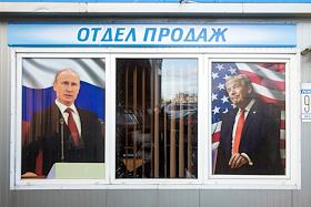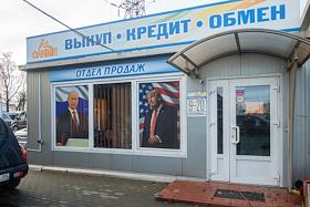 Жанровая фотография. Окно в павильоне компании "Олимп" с портретами Путина и Трампа.