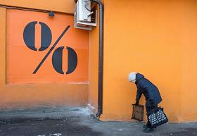 Жанровая фотография. Женщина сумкой возле стены со знаком "проценты".