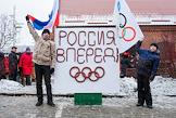 Жанровая фотография. Плакат в поддержку российских олимпийцев "Россия, вперед!", выполненный из колбасы.