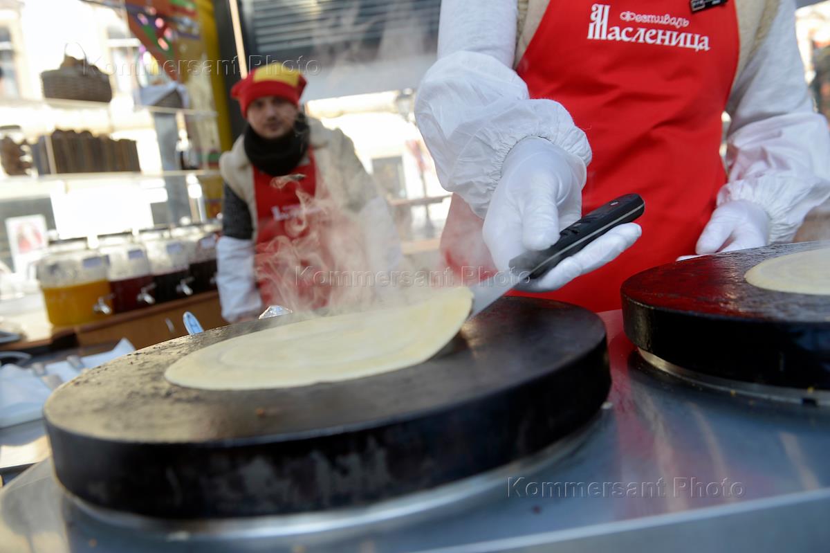 Московский фестиваль "Масленица" в городе. Жанровая фотография. Приготовление блинов на улице.