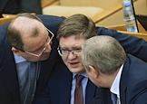 Заседание Государственной Думы (ГД) России. Слева направо: член комитета ГД России по бюджету и налогам Виктор Селиверстов, член Комитета ГД по бюджету и налогам Андрей Исаев и заместитель председателя ГД Сергей Неверов перед началом заседания.