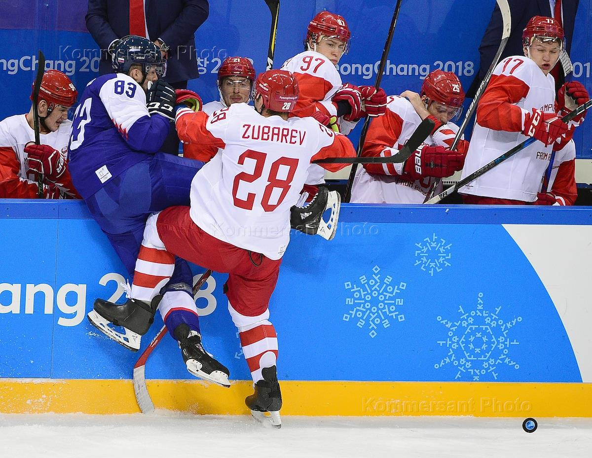 XXIII Зимние Олимпийские игры в Пхенчхане. Матч группового этапа между сборной командой Словакии и командой олимпийских спортсменов из России на соревнованиях по хоккею среди мужчин прошел на стадионе Каннын-центр. Игрок команды олимпийских спортсменов из России Артем Зуб (справа) во время матча.