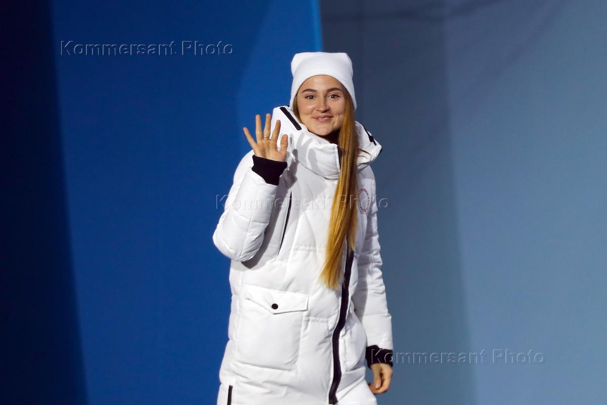 XXIII Зимние Олимпийские игры в Пхенчхане. Церемония награждения призеров соревнований по лыжным гонкам в спринте классическим стилем среди женщин. Олимпийская спортсменка из России Юлия Белорукова (бронзовая медаль) на церемонии.