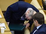 Пленарное заседание Государственной думы (ГД) России. Член комитета ГД России по транспорту и строительству Виктор Дерябкин (в центре) и член комитета ГД России по жилищной политике и жилищно-коммунальному хозяйству Михаил Чернышев (справа) во время заседания.
