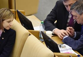Пленарное заседание Государственной думы (ГД) России. Член комитета ГД по образованию и науке Сергей Боженов (справа) и заместитель председателя комитета ГД по безопасности и противодействию коррупции Наталья Поклонская (слева) во время заседания.