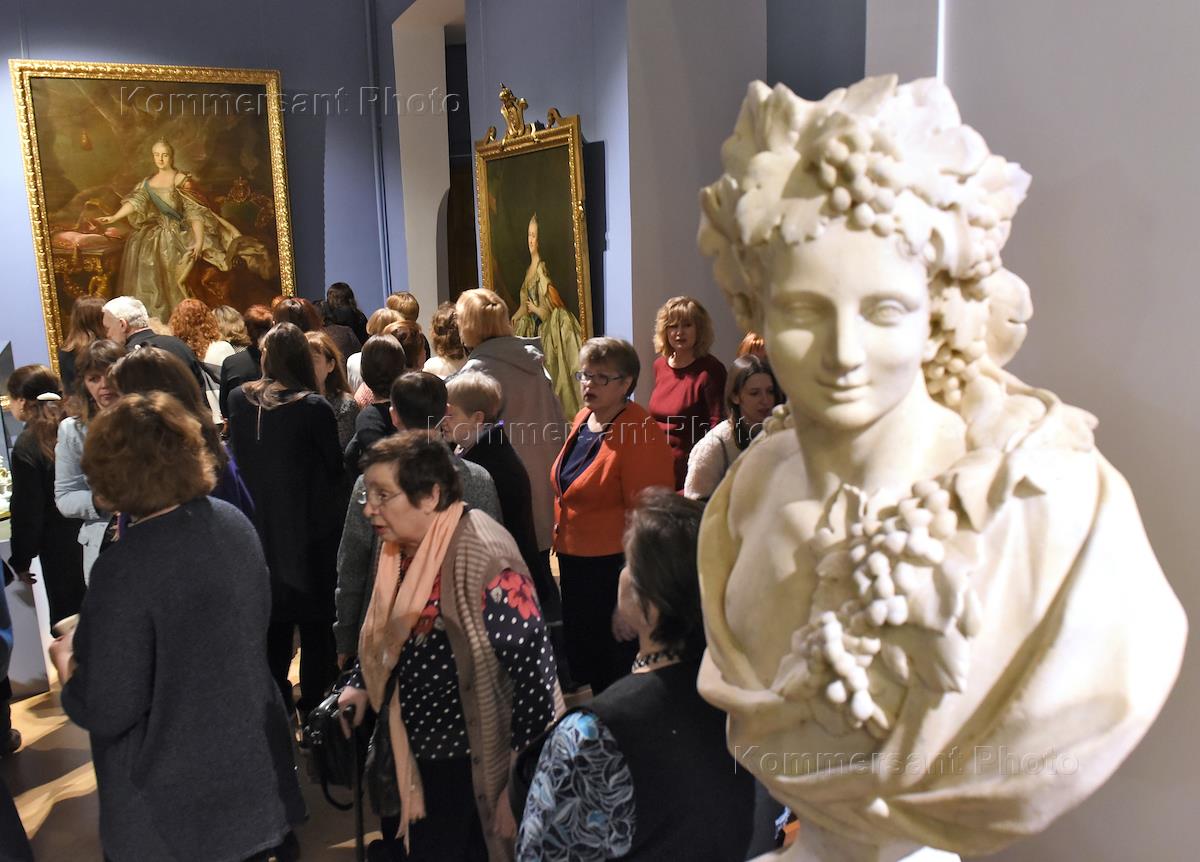 Церемония открытия выставки "Екатерина Великая в стране и мире" из цикла "Сага о Романовых" прошла в Инженерном замке Государственного Русского музея. Посетители на выставке.