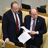 Пленарное заседание Государственной Думы (ГД) России. Член комитета ГД России по образованию и науке Алексей Загребин (слева) и член комитета ГД России по образованию и науке Владимир Кононов (справа) во время заседания.