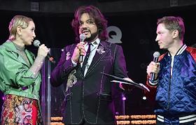 Закрытый коктейль по случаю выхода ежегодного рейтинга "100 самых стильных" по версии журнала GQ. Слева направо: издатель журнала GQ Ирина Елизарова, певец Филипп Киркоров и солист группы "Моральный кодекс" Сергей Мазаев во время вечеринки.