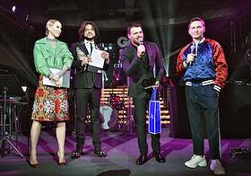 Закрытый коктейль по случаю выхода ежегодного рейтинга "100 самых стильных" по версии журнала GQ. Певец Сергей Мазаев (второй справа) с супругой, журналистом Галиной (вторая слева) на коктейле в здании Центрального рынка.