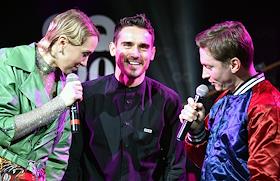 Закрытый коктейль по случаю выхода ежегодного рейтинга "100 самых стильных" по версии журнала GQ. Слева направо: издатель журнала GQ Ирина Елизарова, модель Артур Кульков и главный редактор журнала GQ Игорь Гаранин на коктейле в здании Центрального рынка.