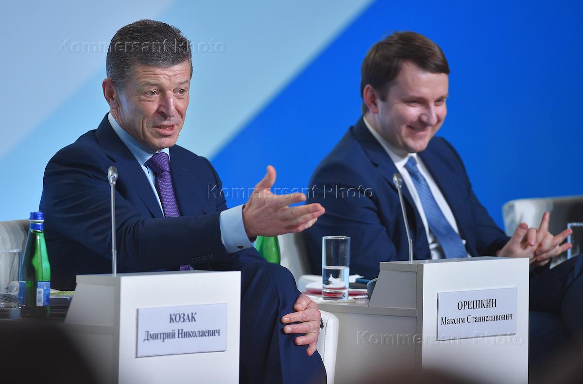 Всероссийский инвестиционный форум "Сочи-2018". Встреча председателя правительства России Дмитрия Медведева с высшими должностными лицами субъектов Российской Федерации. Заместитель председателя правительства России Дмитрий Козак (слева) и министр экономического развития Максим Орешкин (справа) во время встречи.