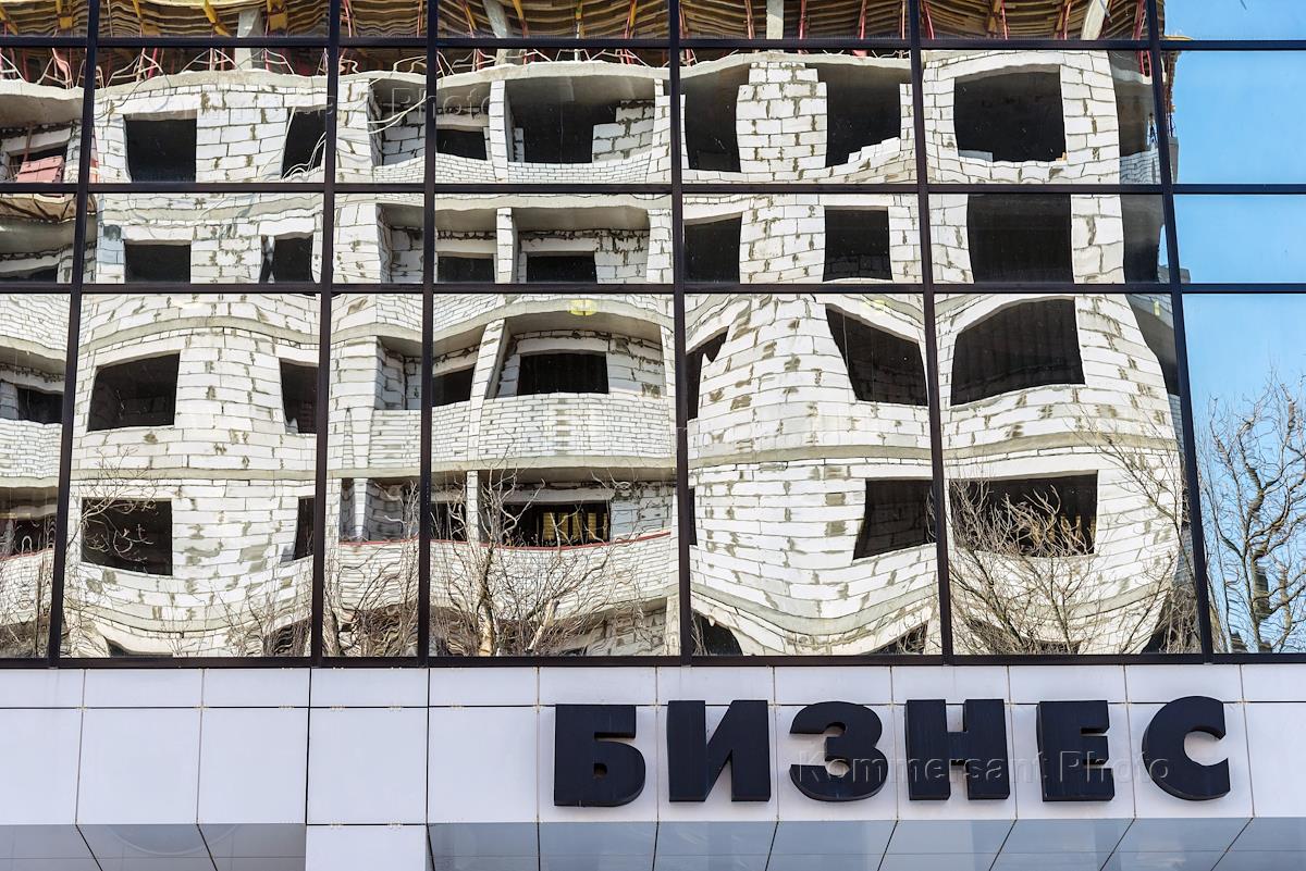 Жанровая фотография. Новостройка. Строительство многоэтажного жилого дома. Отражение дома в стекле бизнес-центре.