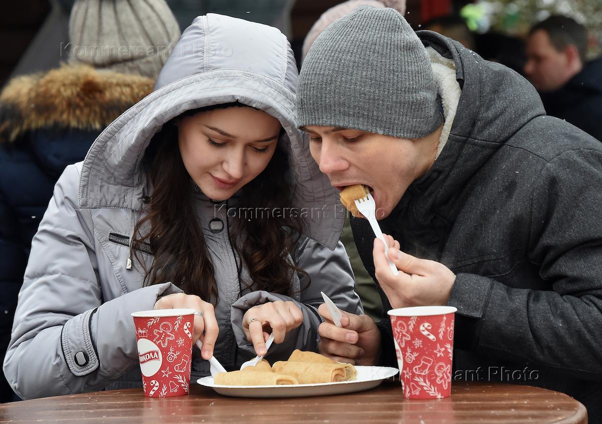 Празднование Масленицы прошло на Манежной площади. Девушка и молодой человек во время поедания блинов на масленичных гуляниях.