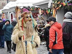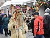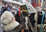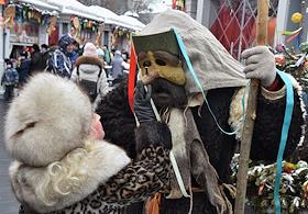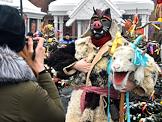 Празднование Масленицы прошло на Манежной площади. Ряженый в тулупе навыворот и в маске во время масленичных гуляний.