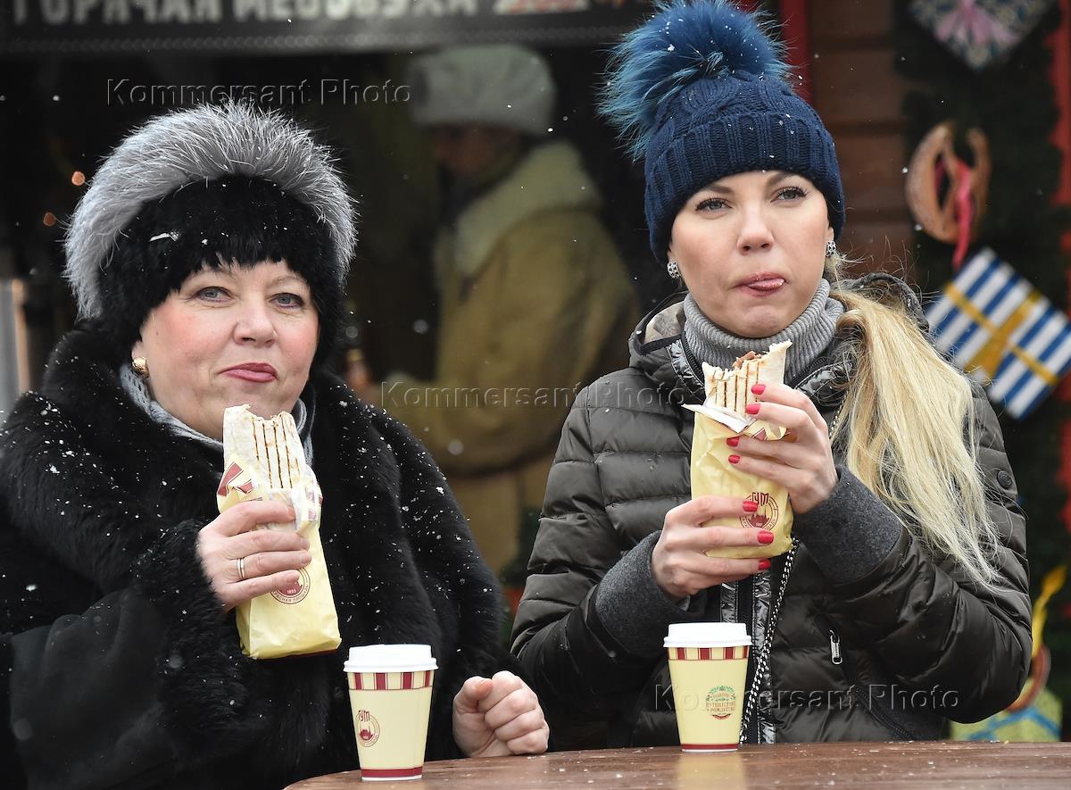 Празднование Масленицы прошло на Манежной площади. Женщины едят шаурму во время масленичных гуляний.