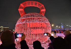Празднование Масленицы прошло в Парке имени Горького. Декоративная скульптура-гиря "Тяжесть зимы", набитая соломой.