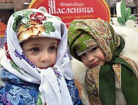 Празднование Масленицы прошло на Манежной площади. Девочки в павло-0посадских платках во время масленичных гуляний.