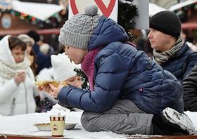 Празднование Масленицы прошло на Манежной площади. Мальчик во время поедания блинов.