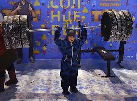 Празднование Масленицы прошло в Парке имени Горького. Ребенок со штангой во время масленичных гуляний.