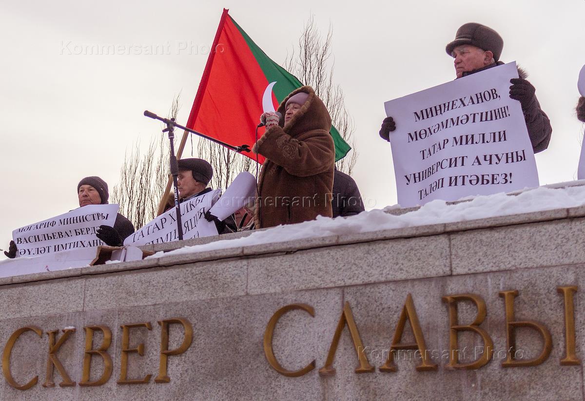 Митинг в защиту татарского языка прошел в Сквере Славы в казанском микрорайоне Горки-1. Участники во время митинга .