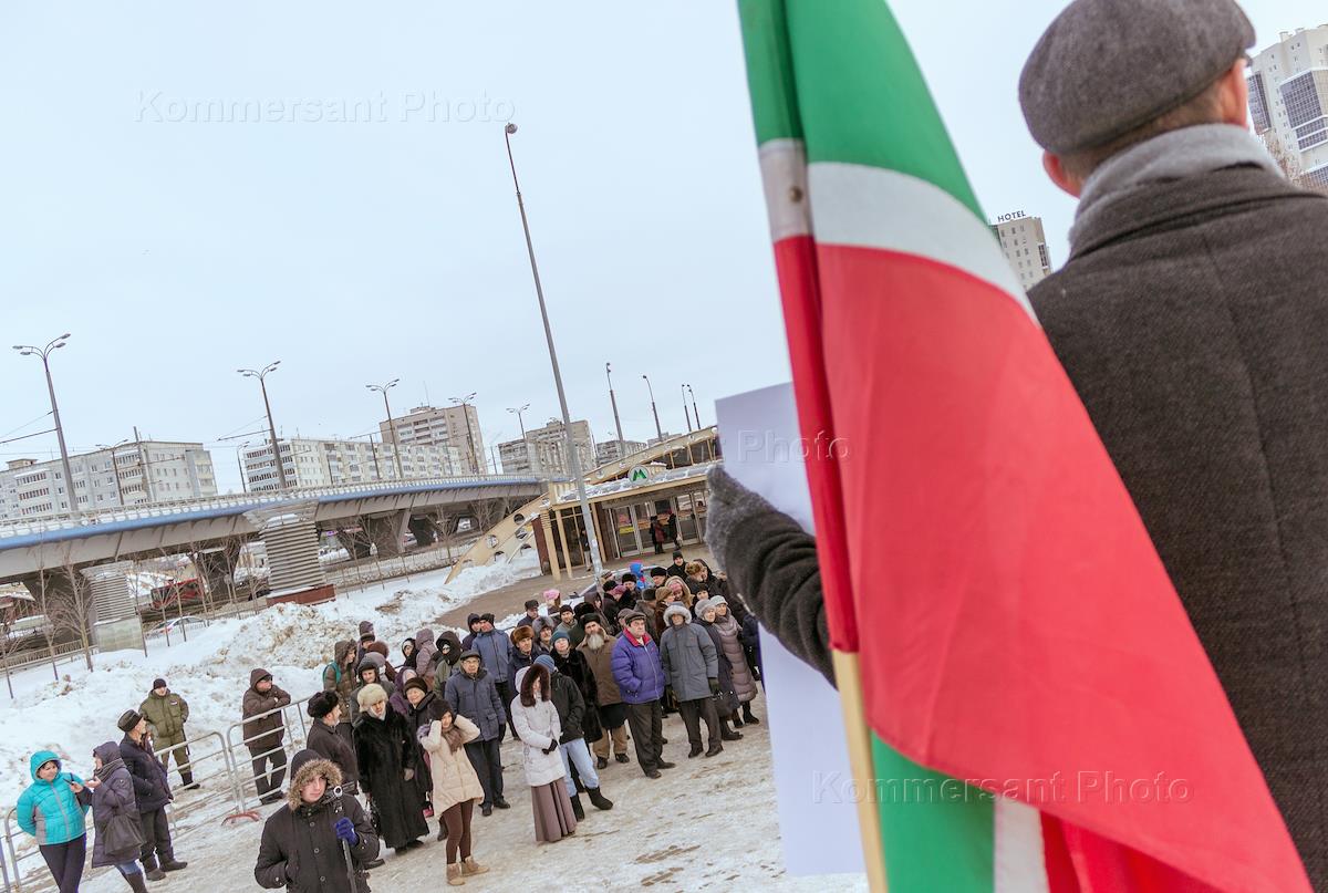 Митинг в защиту татарского языка прошел в Сквере Славы в казанском микрорайоне Горки-1. Участники во время митинга .