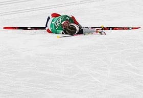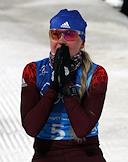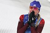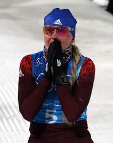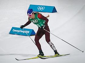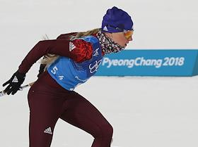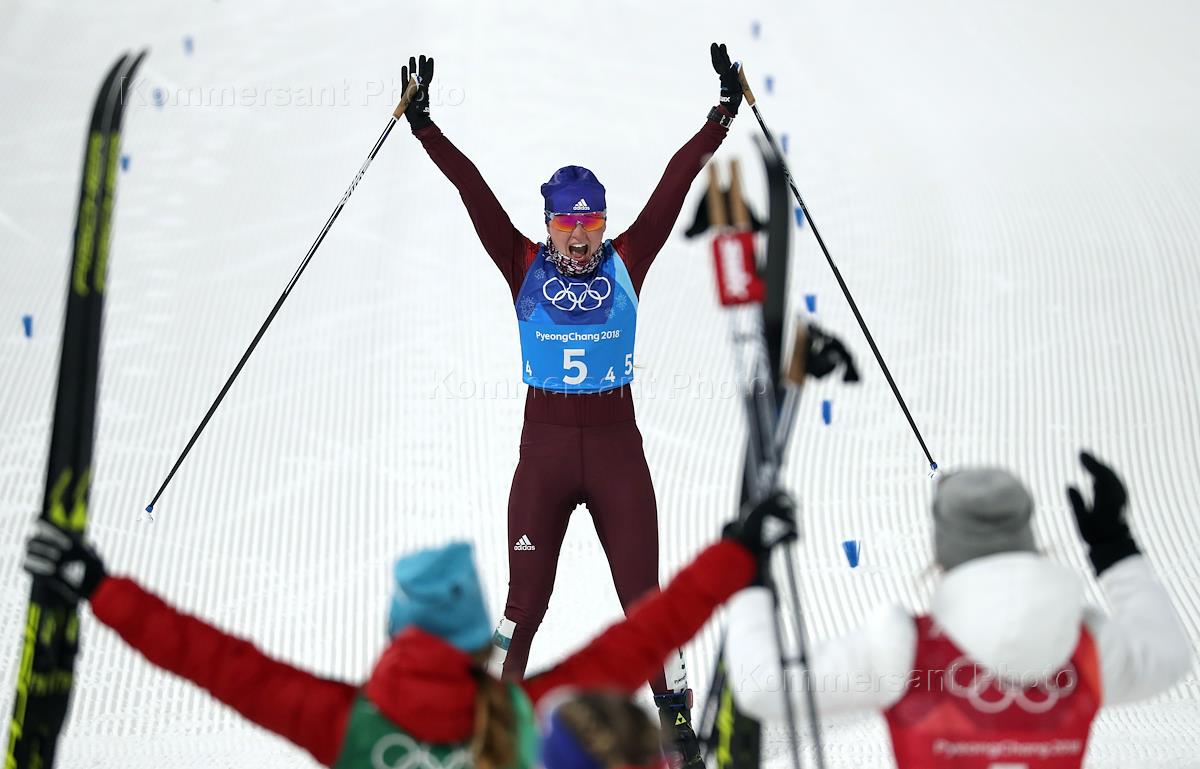 XXIII Зимние Олимпийские игры в Пхенчхане. Эстафетная лыжная гонка 4 х 5 км среди женщин. Российская спортсменка Анна Нечаевская во время финиша.
