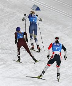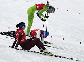 XXIII Зимние Олимпийские игры в Пхенчхане. Эстафетная лыжная гонка 4 х 5 км среди женщин. Слева направо: российская сопртсменка Анна Нечаевская, шведская спортсменка Стина Нильсон и норвежская спортсменка Марин Бьорген во время соревнований.