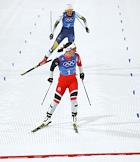 XXIII Зимние Олимпийские игры в Пхенчхане. Эстафетная лыжная гонка 4 х 5 км среди женщин. Шведская спортсменка Стина Нильсон (слева) и норвежская спортсменка Марин Бьорген (справа) во время финиша.