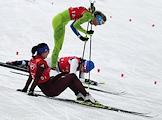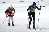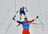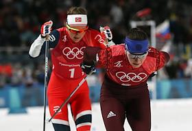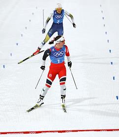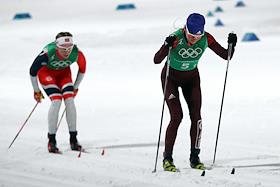 XXIII Зимние Олимпийские игры в Пхенчхане. Эстафетная лыжная гонка 4 х 5 км среди женщин. Российская спортсменка Наталья Непряева (справа) и норвежская спортсменка Ингвильд Флугстад Эстберг (слева) во время соревнований.