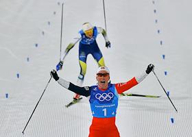 XXIII Зимние Олимпийские игры в Пхенчхане. Эстафетная лыжная гонка 4 х 5 км среди женщин. Норвежская спортсменка Астрид Якобсен после прохождения своего этапа эстафеты.