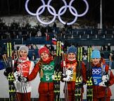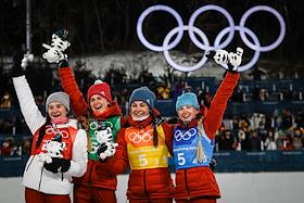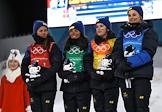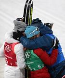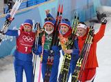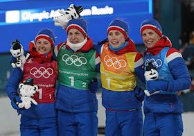 XXIII Зимние Олимпийские игры в Пхенчхане. Эстафетная лыжная гонка 4 х 5 км среди женщин. Слева направо: норвежские спортсменки Ингвильд Флугстад Эстберг, Астрид Якобсен, Рагниль Хага и Марит Бьорген после завершения эстафетной гонки.