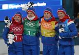XXIII Зимние Олимпийские игры в Пхенчхане. Эстафетная лыжная гонка 4 х 5 км среди женщин. Слева направо: российские спортсменки Анастасия Седова, Юлия Белорукова, Наталья Непряева и Анна Нечаевская после завершения эстафетной лыжной гонки.
