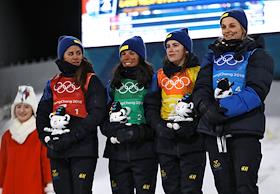 XXIII Зимние Олимпийские игры в Пхенчхане. Слева направо: призеры эстафетной лыжной гонки 4 х 5 км среди женщин - спортсменки из Швеции Анна Хог, Шарлотта Калла, Эбба Андерсон и Стина Нильссон, завоевавшие серебряные медали, во время церемонии награждения.