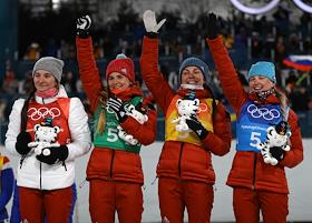 XXIII Зимние Олимпийские игры в Пхенчхане. Слева направо: призеры эстафетной лыжной гонки 4 х 5 км среди женщин - спортсменки из России Наталья Непряева, Юлия Белорукова, Анастасия Седова и Анна Нечаевская, завоевавшие бронзовые медали, во время церемонии награждения.