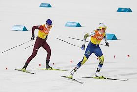 XXIII Зимние Олимпийские игры в Пхенчхане. Эстафетная лыжная гонка 4 х 5 км среди женщин. Российская спортсменка Анастасия Седова (слева) и шведская спортсменка Эбба Андерсон (справа) во время соревнований.