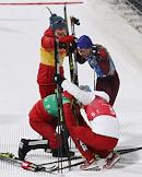 XXIII Зимние Олимпийские игры в Пхенчхане. Эстафетная лыжная гонка 4 х 5 км среди женщин. Российская спортсменка Наталья Непряева (слева) после прохождения своего этапа эстафеты.