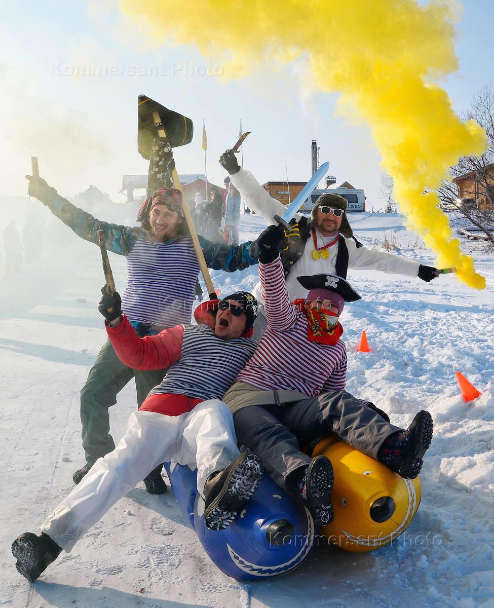 Празднование "Сибирской Масленицы" в селе Новотырышкино, Алтайского края. Мужчины в костюмах пиратов во время катания с горы.