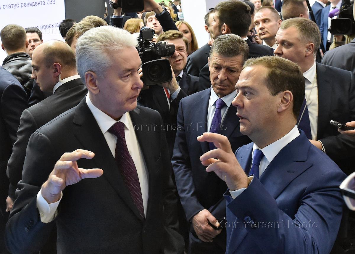 Российский инвестиционный форум 2018 в Сочи. Слева направо: мэр Москвы Сергей Собянин, заместитель председателя правительства России Дмитрий Козак и председатель Правительства России Дмитрий Медведев во время форума.