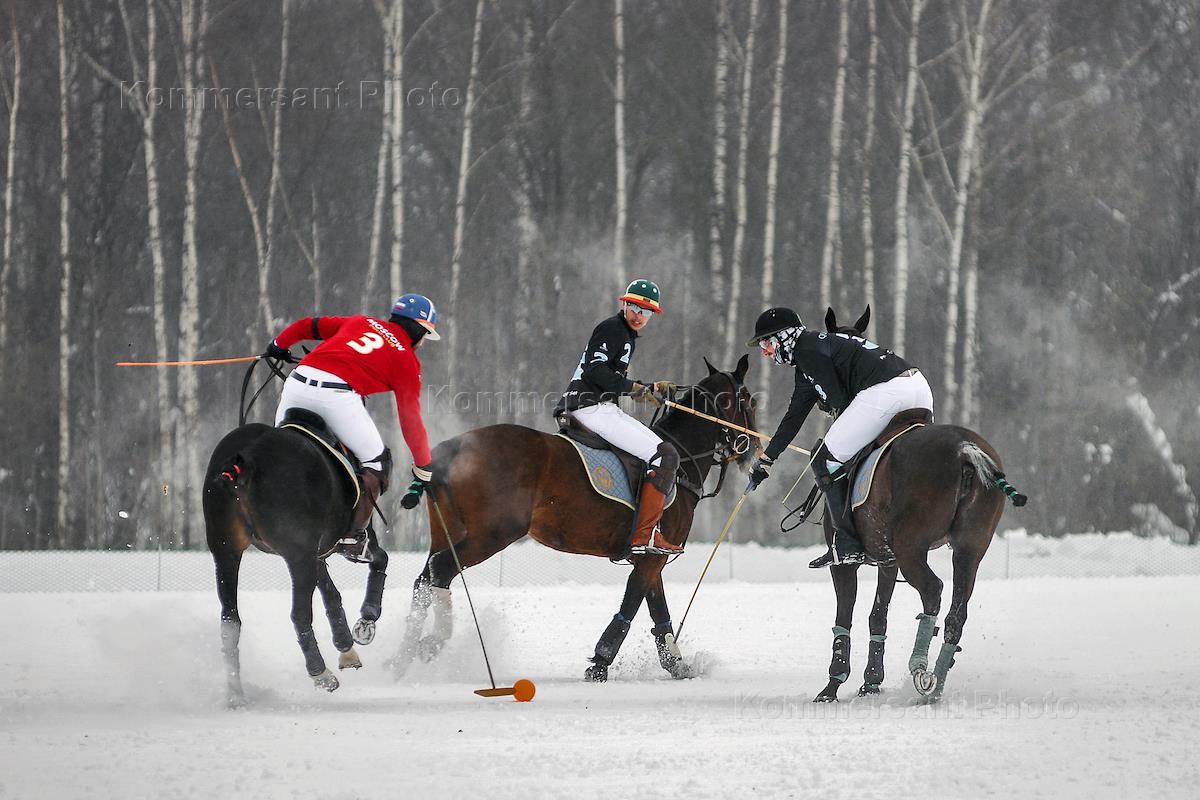 Чемпионат России по поло на снегу прошел в "Московском поло клубе". Справа налево: член российской команды "Метрополь" Алексис Родзянко, Александр Патютко и Михаил Родзянко во время чемпионата.