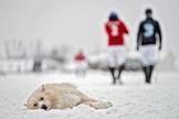 Чемпионат России по поло на снегу прошел в "Московском поло клубе". Жанровая фотография. Собака лежит на снегу.