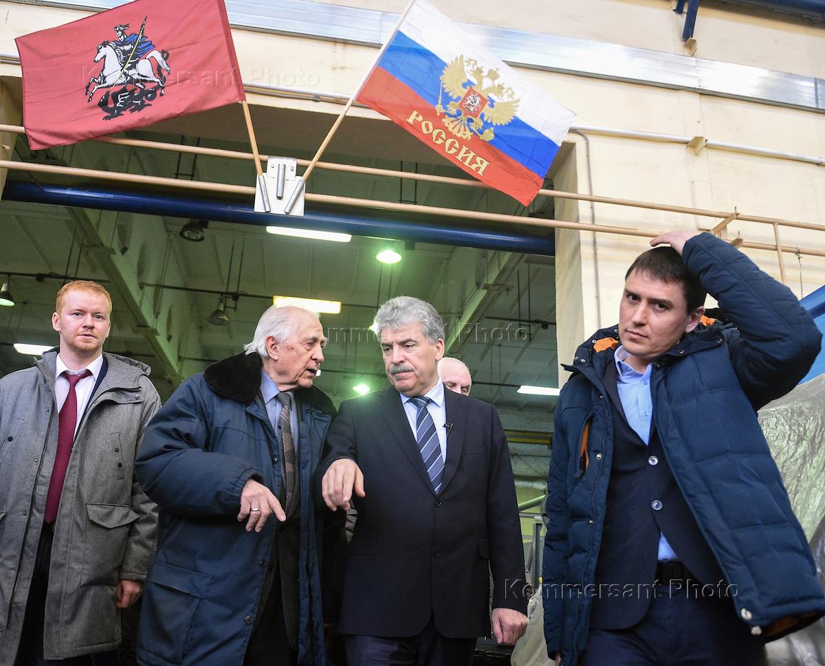 Кандидат на должность президенты России от КПРФ и народно-патриотических сил России Павел Грудинин (в центре) и член комитета Государственной думы России по федеративному устройству и вопросам местного самоуправления Денис Парфенов (слева) во время встречи с трудовым коллективом Московского инструментального завода.