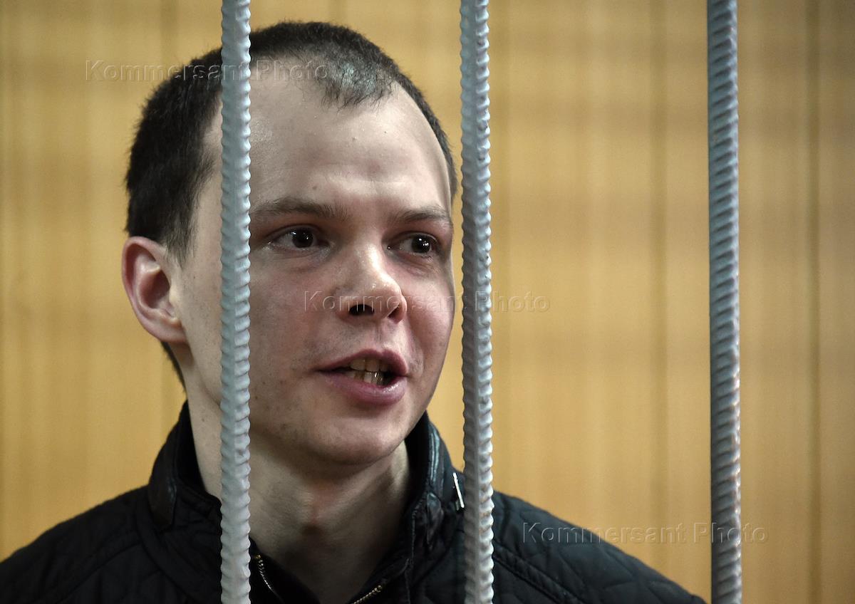 Один из участников прошедшей 26 марта 2017 года несанкционированной акции Дмитрий Борисов (слева), обвиняемый в применении насилия к полицейскому, во время оглашения приговора в Тверском районном суде.