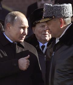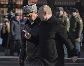 Церемония возложения венка к Могиле Неизвестного солдата в День защитника Отечества. Президент России Владимир Путин (слева) и министр обороны России Сергей Шойгу (справа) во время церемонии.