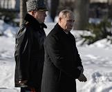 Церемония возложения венка к Могиле Неизвестного солдата в День защитника Отечества. Президент России Владимир Путин (справа) и министр обороны России Сергей Шойгу (слева) во время церемонии .