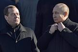 Церемония возложения венка к Могиле Неизвестного солдата в День защитника Отечества. Председатель правительства России Дмитрий Медведев (слева) и президент России Владимир Путин (справа) во время церемонии.
