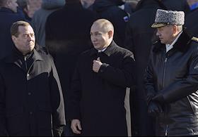Церемония возложения венка к Могиле Неизвестного солдата в День защитника Отечества. Слева направо: председатель правительства России Дмитрий Медведев, президент России Владимир Путин и министр обороны России Сергей Шойгу во время церемонии .