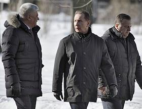 Церемония возложения венка к Могиле Неизвестного солдата в День защитника Отечества. Слева направо: помощник президента России Андрей Фурсенко, министр спорта России Павел Колобков и министр здравоохранения России Вероника Скворцова во время церемонии.