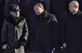 Церемония возложения венка к Могиле Неизвестного солдата в День защитника Отечества. Слева направо: председатель правительства России Дмитрий Медведев, президент России Владимир Путин и министр обороны России Сергей Шойгу во время церемонии.