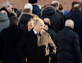 Церемония возложения венка к Могиле Неизвестного солдата в День защитника Отечества. Президент России Владимир Путин (в центре) во время церемонии.