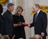 Церемония вручения государственных наград в День защитника Отечества в Кремле. Президент России Владимир Путин (слева) и мать погибшего в Сирии летчика Романа Филиппова, Елена Викторовна (справа) во время церемонии.
